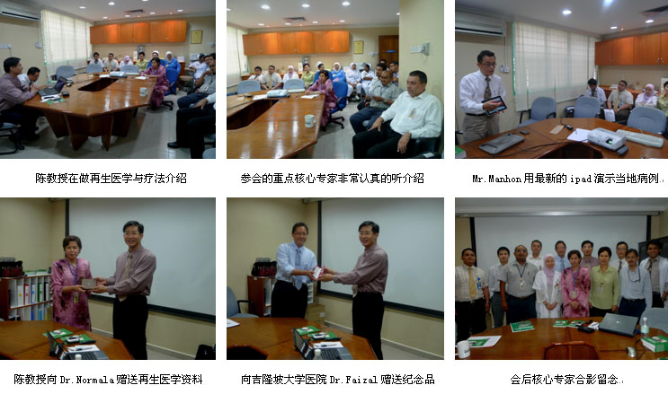 6、2010年4月23日,吉隆坡中央医院(马来西亚最大医院,2500病床和吉隆坡大学医院的烧伤再生医学手艺培训和学术交流会在吉隆坡中央医院烧伤整形科教研室举行。培训会由吉隆坡中央医院烧伤整形科主任Dr. Normala教授主持,来自这两家主要医院的烧伤、整形和创伤专业的20余名专家加入了培训会,陈教授应邀向参会的主要专家演讲了烧伤再生医学与疗法的皮肤再生气理、临床手艺规范和该手艺在其它多学科的应用,引起了各人极大的兴趣和学习热情,为下阶段烧伤再生医学手艺进入这两家马来西亚最大、最主要的医院,做好了充分的准备。